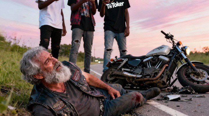 Three teenagers hit a motorcyclist and, instead of dialing for help, aimed their phones at him like it was a show. They laughed while a 64-year-old grandfather clawed across the pavement toward the mangled remains of his Harley, his left leg folded the wrong way, blood spreading under his helmet.