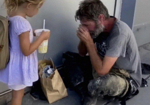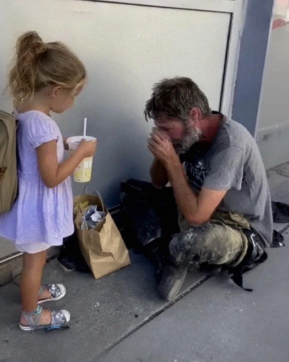 “Sir, don’t be sad,” she said gently. “It’s a nice day. Here, please take this.” She handed him her unopened lemonade and three crumpled dollar bills she had saved in her rainbow coin purse. “You should go eat. I like McDonald’s.”