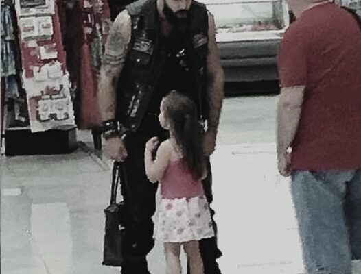 The knock of shopping carts and fluorescent hum made the Walmart feel ordinary—until a six-year-old girl ran straight into the arms of a giant biker in a Demons MC vest and clung to him like a life raft.