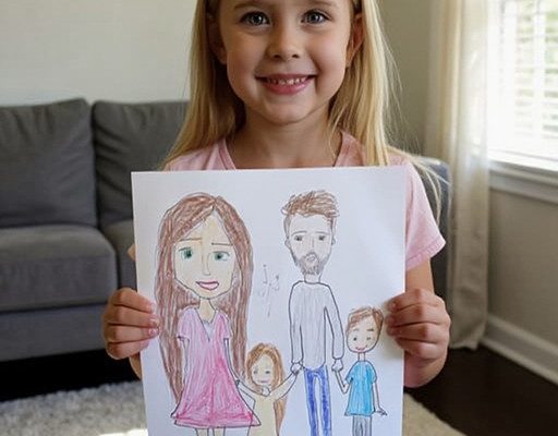 I turned from the stove, spatula midair, and took the paper from her tiny hands. It was a typical kid drawing — uneven lines, bright colors, big heads, small bodies. Me with long hair. My husband, David, with short brown hair and that big square smile she loved to exaggerate. Our daughter in her favorite pink dress, a sun in the corner, flowers along the bottom, little hearts floating above us.