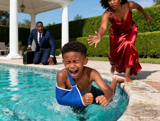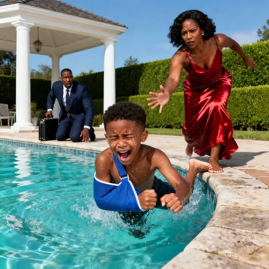 He didn’t remember dropping the leather briefcase. He didn’t feel the polished stones of the terrace under his bare feet as he kicked off his shoes. All he knew—viscerally, instinctively—was that his eight-year-old son was in the deep end of the pool and the cast on his left arm was dragging him under.