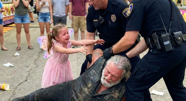 The scream that cut through the fairgrounds belonged to a little girl in a pink fairy dress, and it echoed over a scene no family should ever have to witness. Five-year-old Lily watched two police officers throw her grandfather to the ground because a stranger decided a man in a leather vest couldn’t possibly belong to a child who adored him.